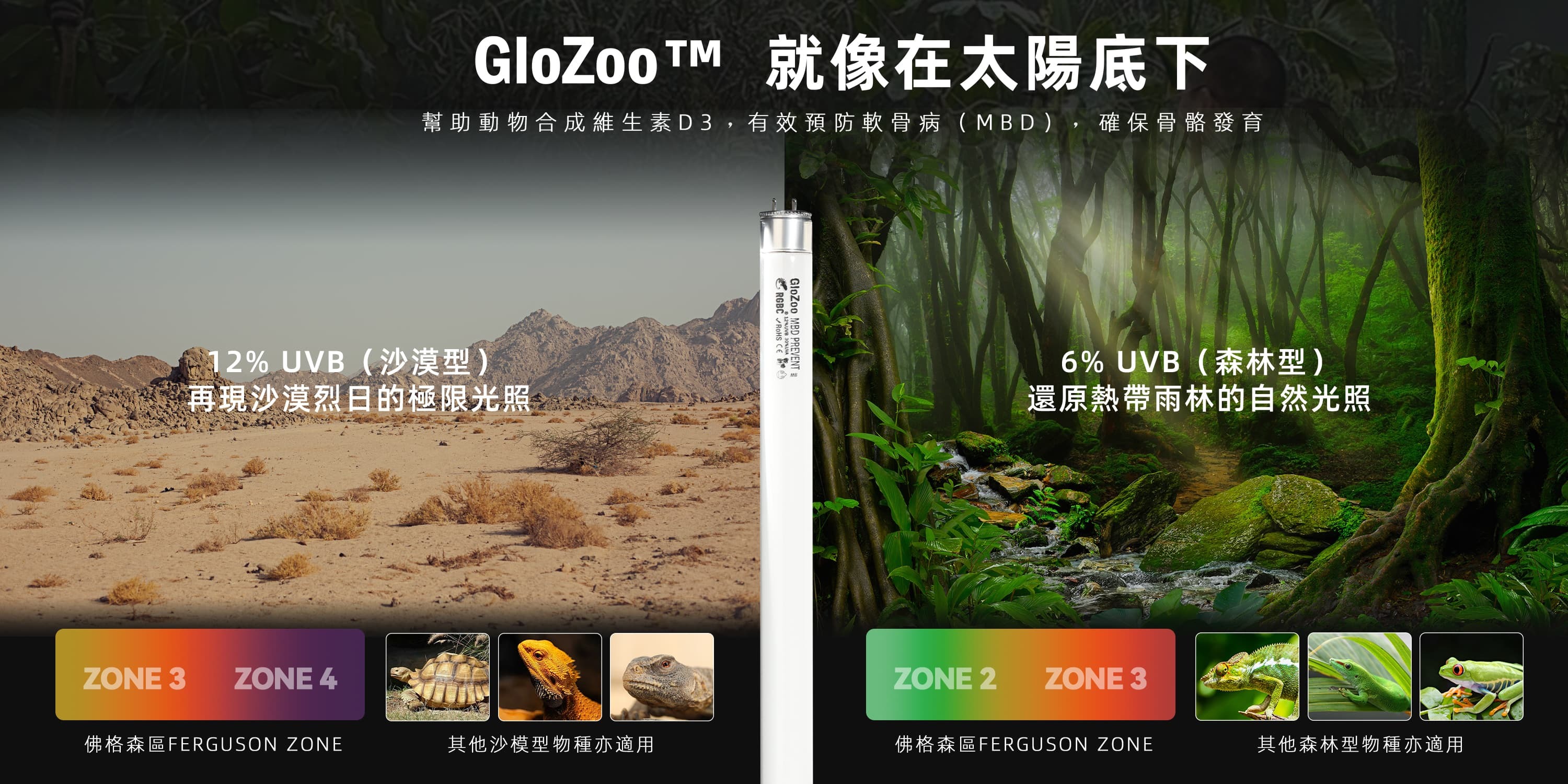 高精密度UVB照明設備,內建高穩二極鎮流器及多重安全保護,搭配GloZoo燈管,有效預防軟骨病並促進D3合成。森林型6%UVB適合雨林物種,沙漠型12%UVB適合沙漠物種。