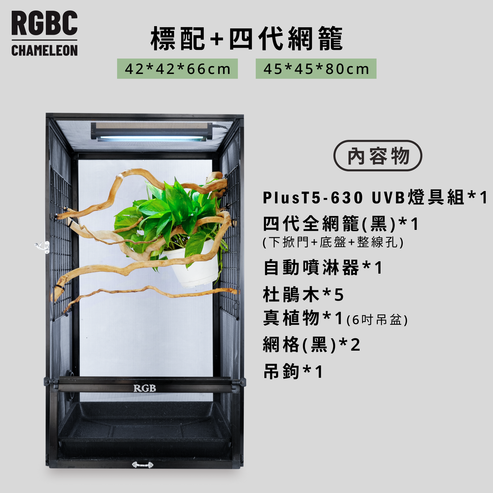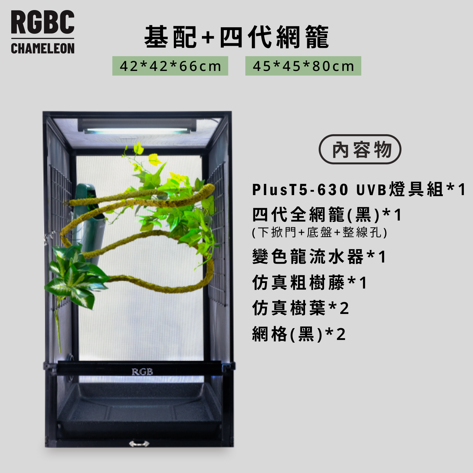 RGBC 全套飼養器具一次備齊變色龍飼養所需:燈具、網籠、噴淋、攀爬與遮蔽配件。提供基配、標配、頂配三種方案,並可加購網籠玻璃門與工具包;從入門到進階皆適用,省時省力、CP 值高。