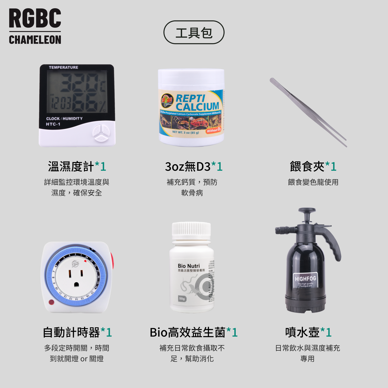 工具包:3oz 無 D3 鈣粉 ×1、自動計時器 ×1、Bio 高效益生菌 ×1、噴水壺 ×1、溫濕度計 ×1、餵食夾 ×1